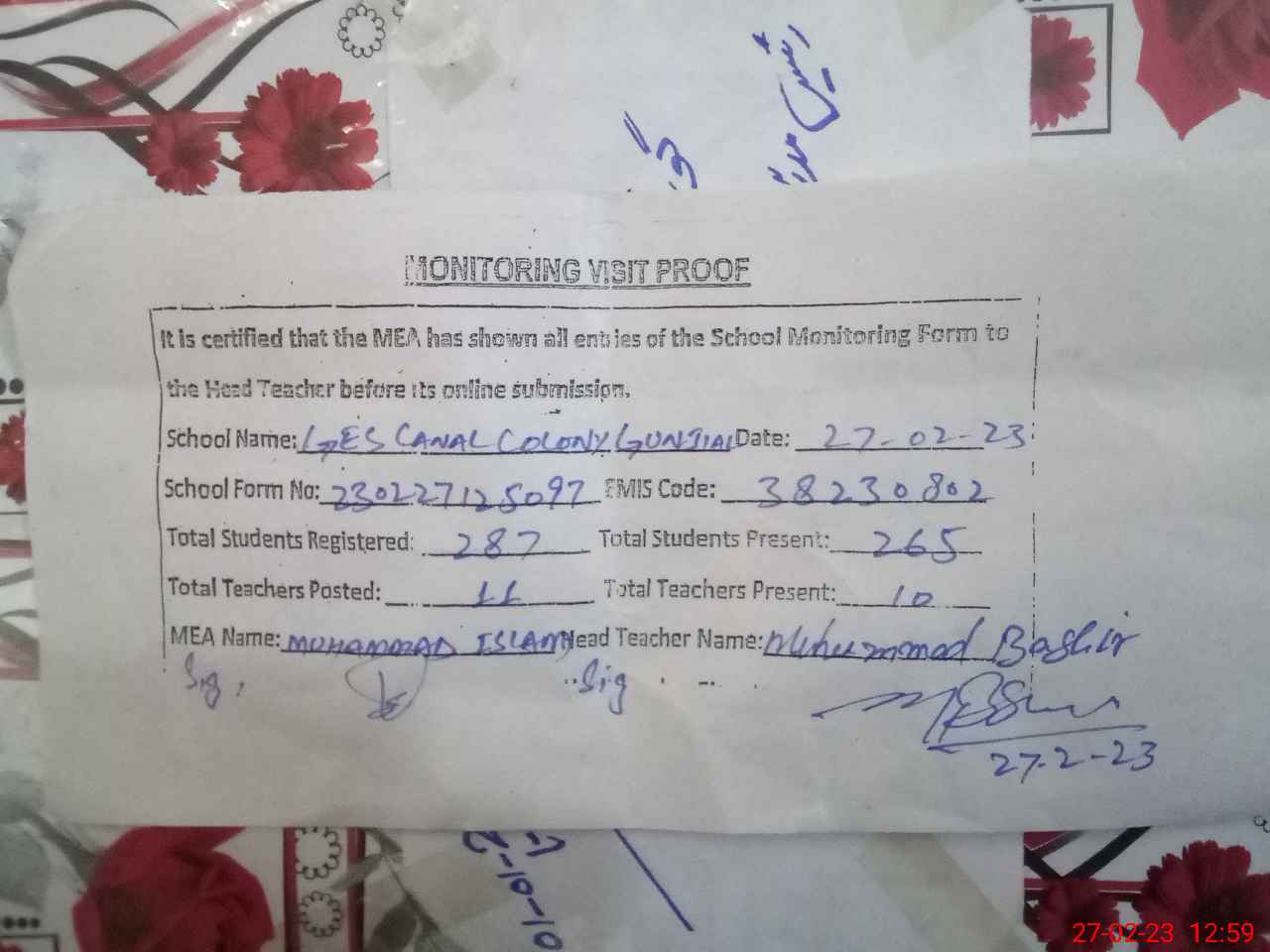 | Attendance Register | Head Teacher | MEA with School | Visit Proof |