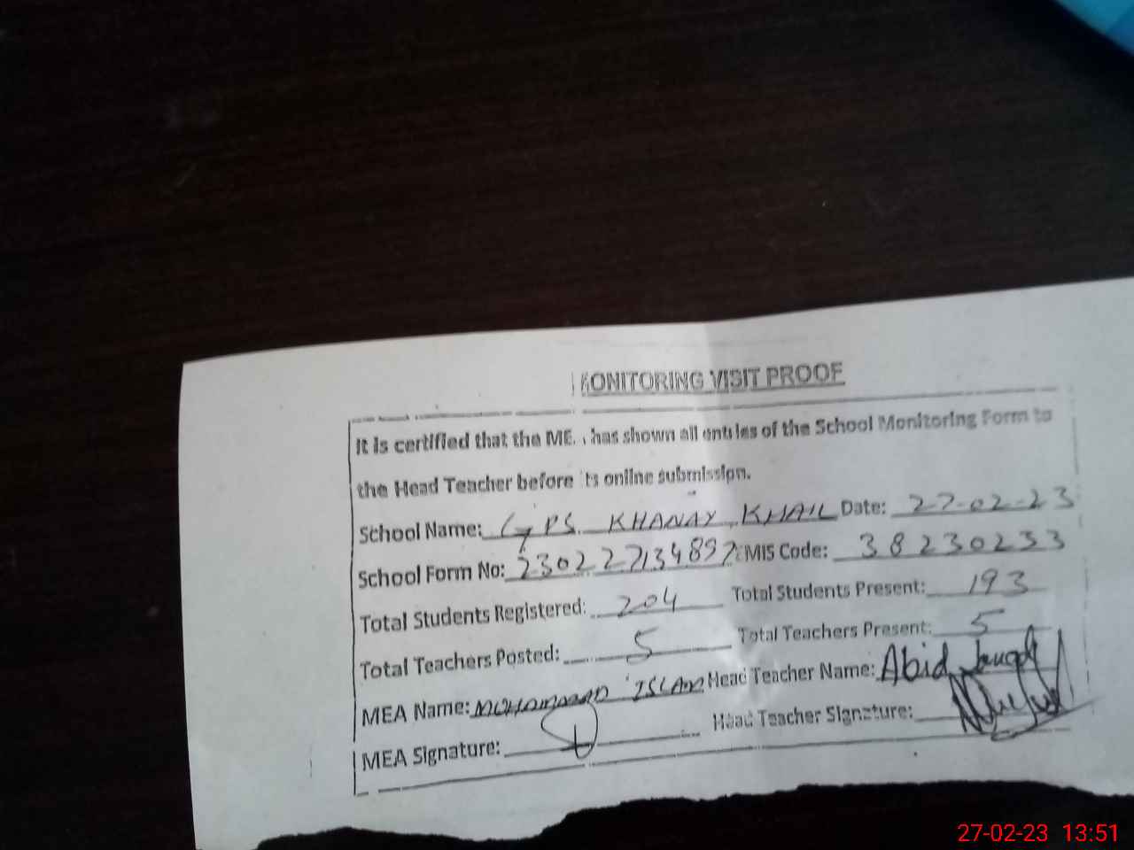 | EMIS Code: 38230233 | Name of School: GPS KHANAY KHAIL | |||