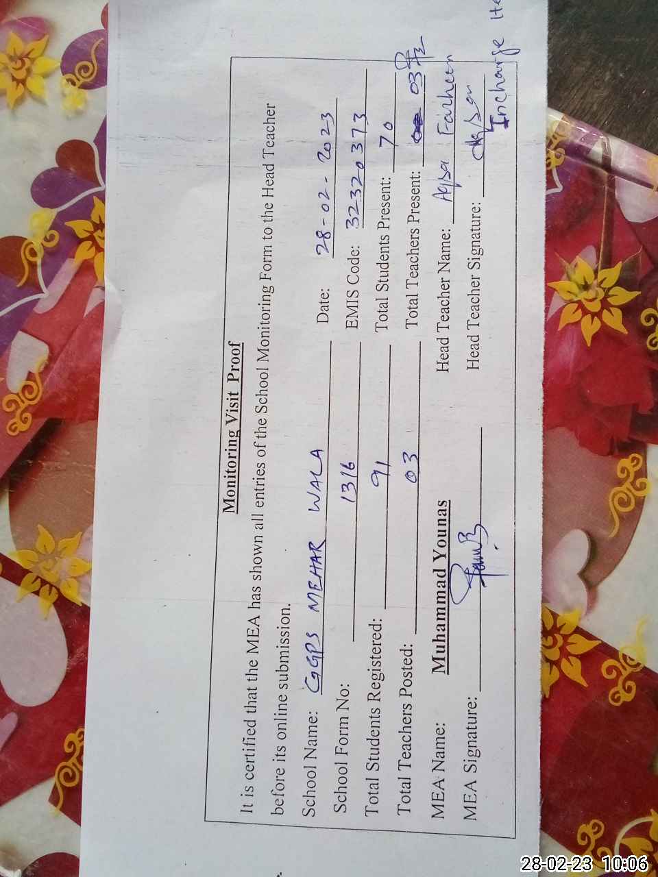 | EMIS Code: 32320373 | Name of School: GGPS MEHAR WALA | |||