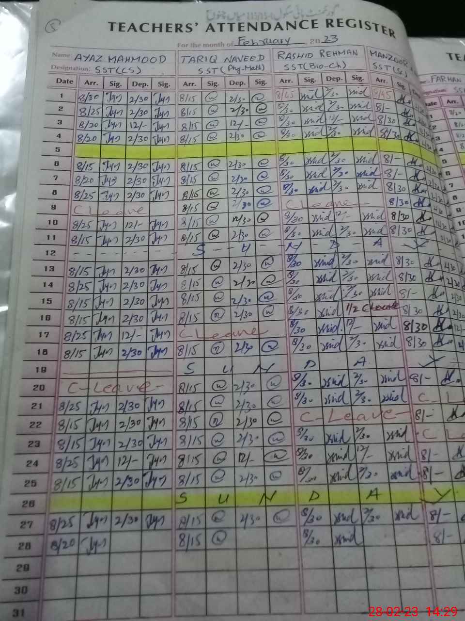 | CNIC | Full Name | Designation | R/C | Absence During Last Calender Month |