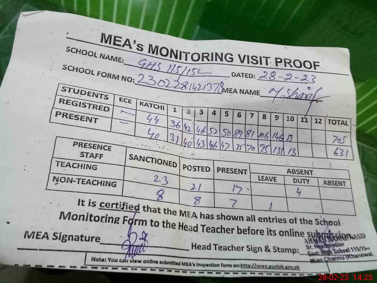 | Attendance Register | Head Teacher | MEA with School | Visit Proof |