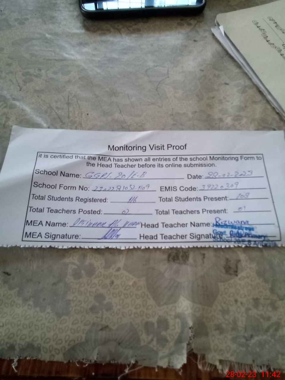 | Attendance Register | Head Teacher | MEA with School | Visit Proof |