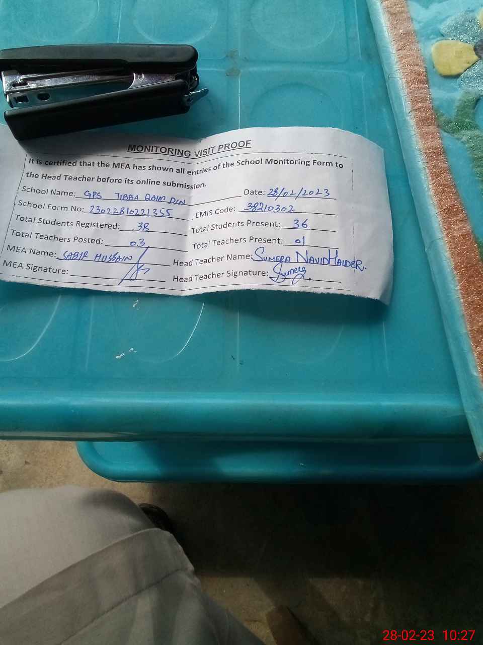 | Attendance Register | Head Teacher | MEA with School | Visit Proof |