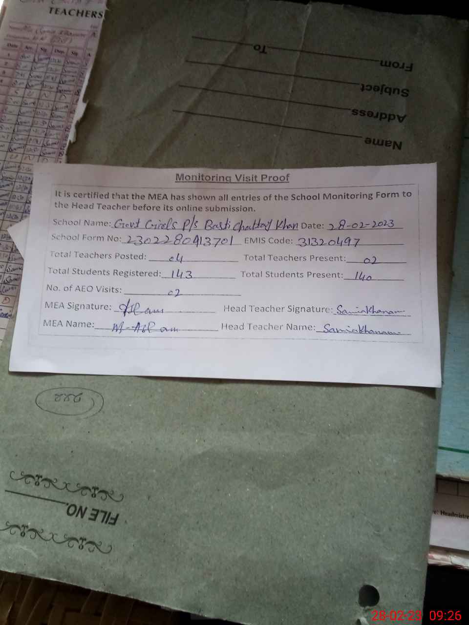 | Attendance Register | Head Teacher | MEA with School | Visit Proof |