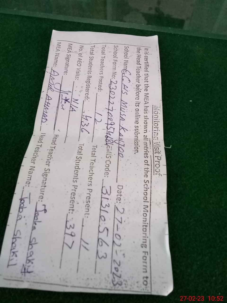 | Attendance Register | Head Teacher | MEA with School | Visit Proof |