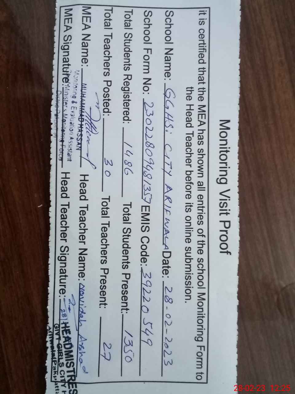 | Attendance Register | Head Teacher | MEA with School | Visit Proof |
