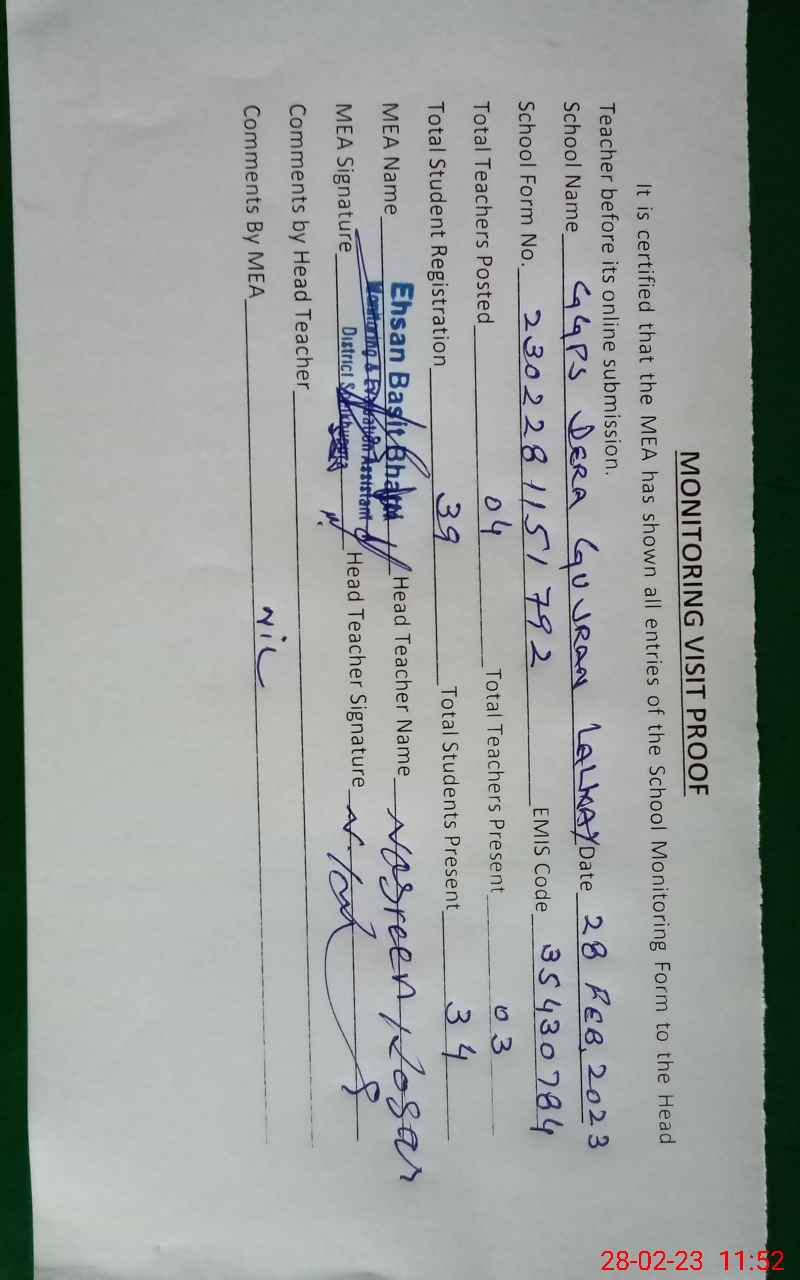 | EMIS Code: 35430784 | Name of School: GGPS DERA GUJRAN LALKAY | |||