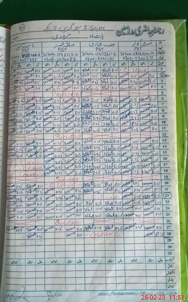 | CNIC | Full Name | Designation | R/C | Absence During Last Calender Month |