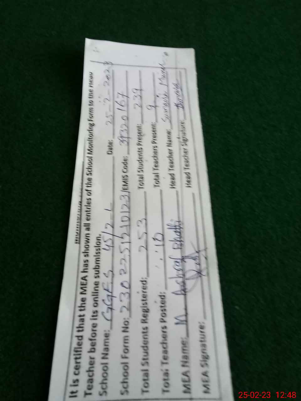 | Certified that this School was Inspected by the Undersigned MEA/DMO Today and the Information Stated Above is as Per Record. | |||||
