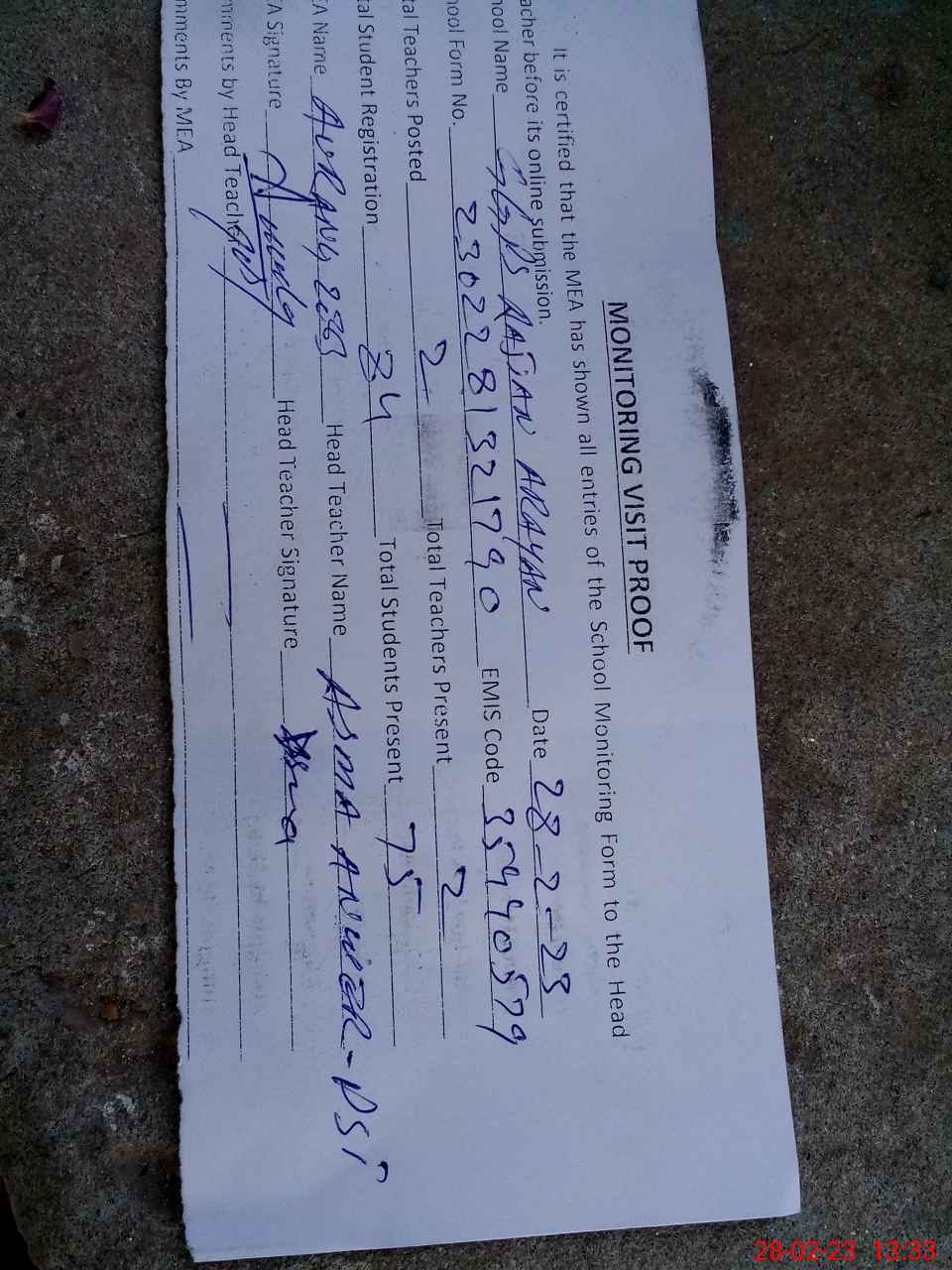 | Attendance Register | Head Teacher | MEA with School | Visit Proof |