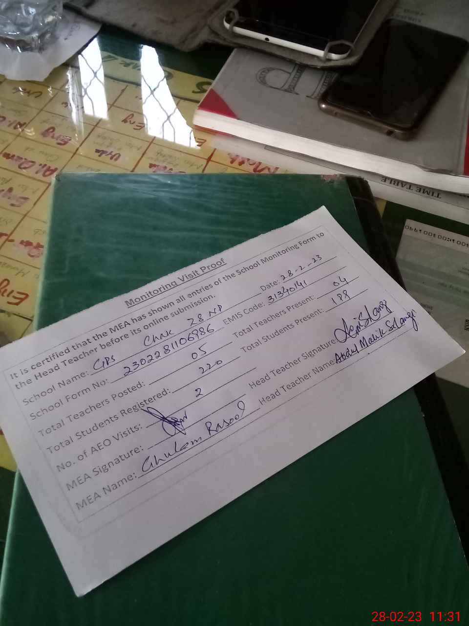 | Attendance Register | Head Teacher | MEA with School | Visit Proof |