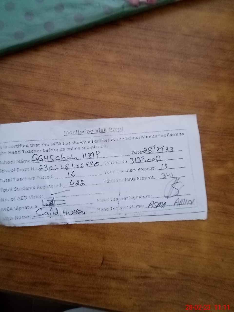 | Name: As**** Am**** Designation: (School Headmaster's/Headmistress's) HEADMISTRESS Phone/Cell Number: 03**** |