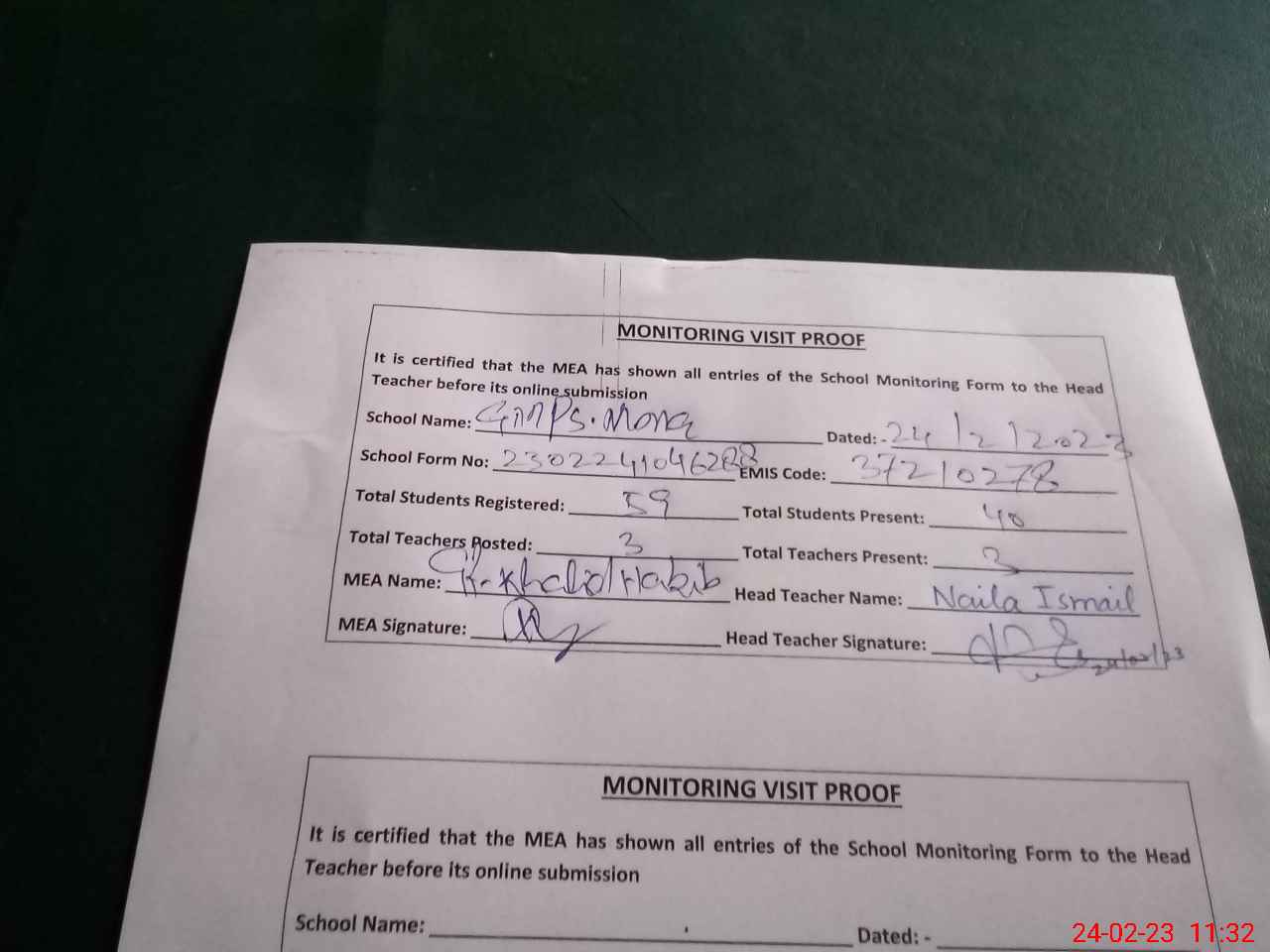| Certified that this School was Inspected by the Undersigned MEA/DMO Today and the Information Stated Above is as Per Record. | |||||