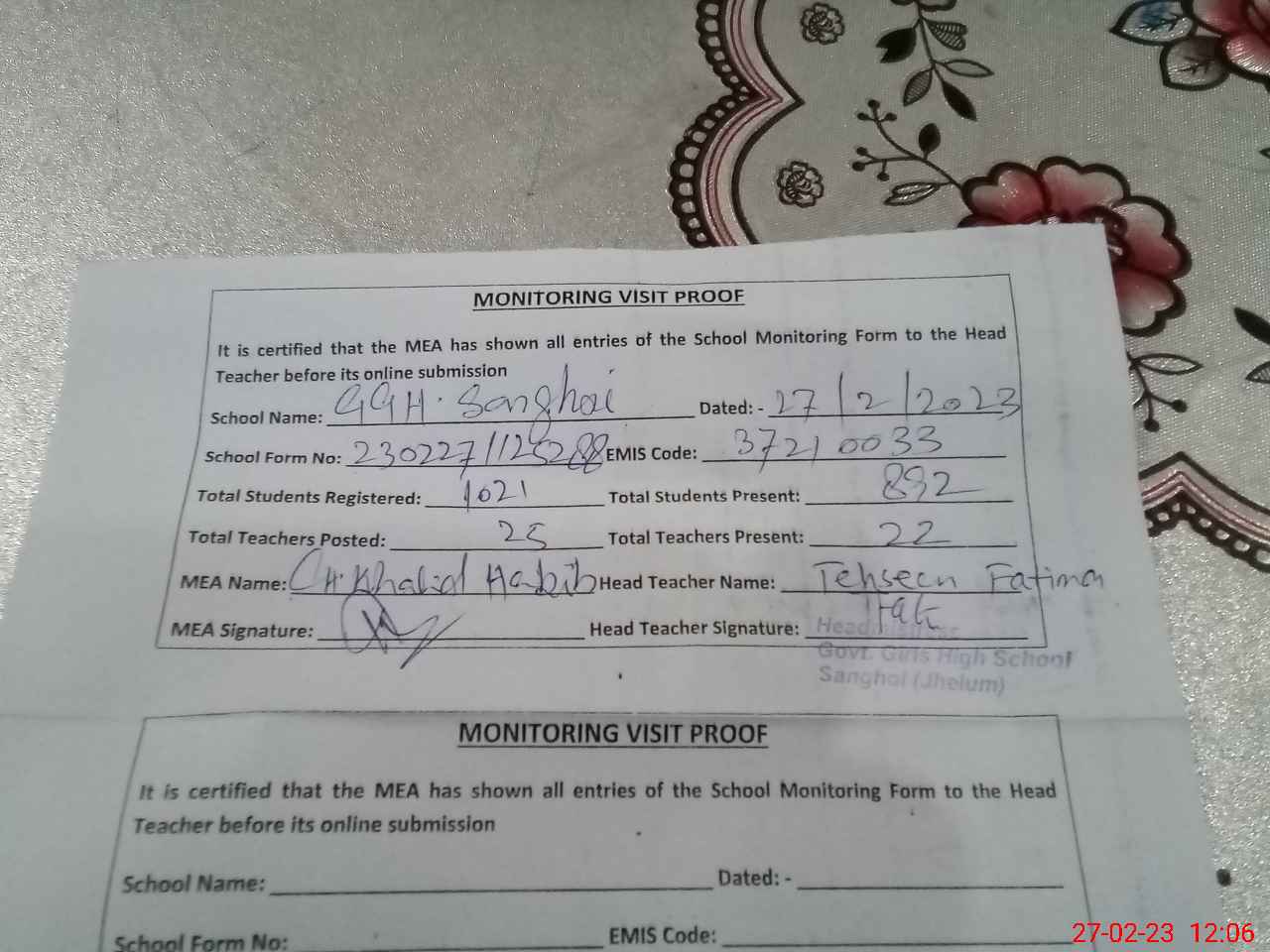 | Attendance Register | Head Teacher | MEA with School | Visit Proof |
