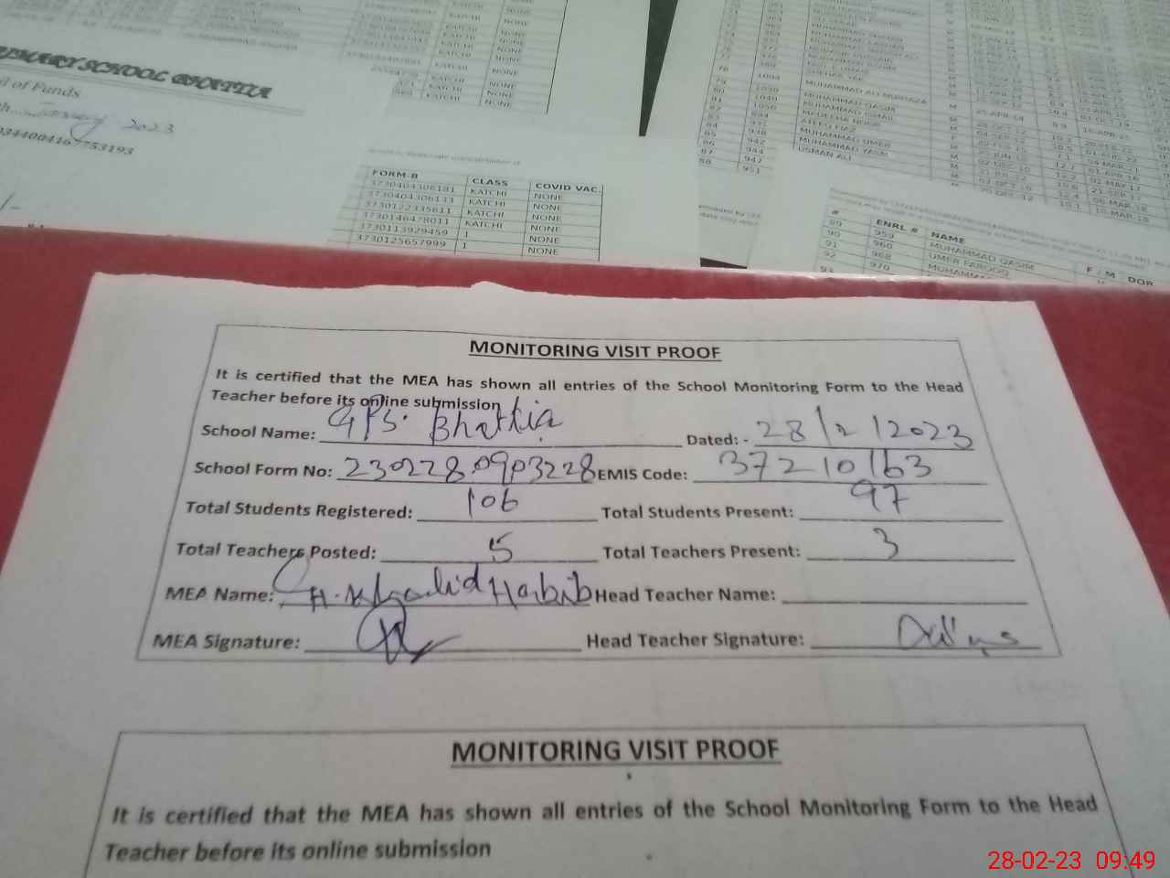 | Attendance Register | Head Teacher | MEA with School | Visit Proof |