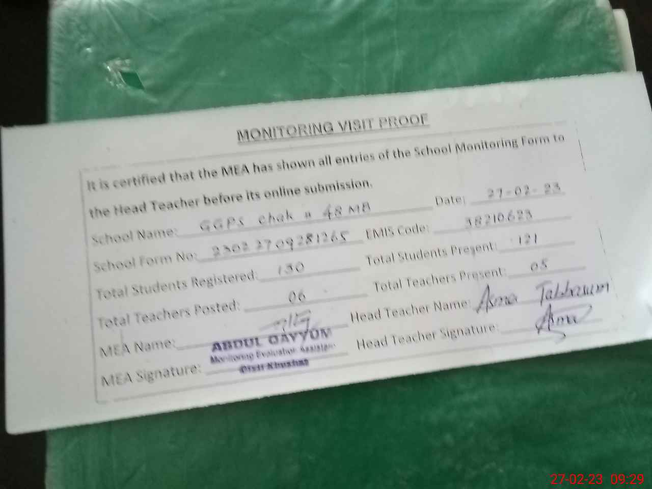 | Attendance Register | Head Teacher | MEA with School | Visit Proof |