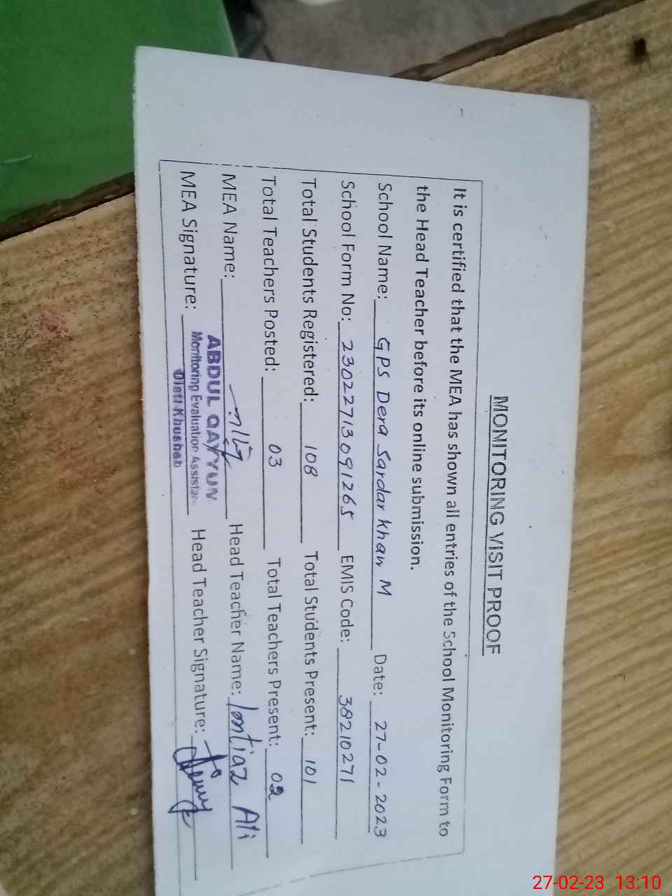| Attendance Register | Head Teacher | MEA with School | Visit Proof |