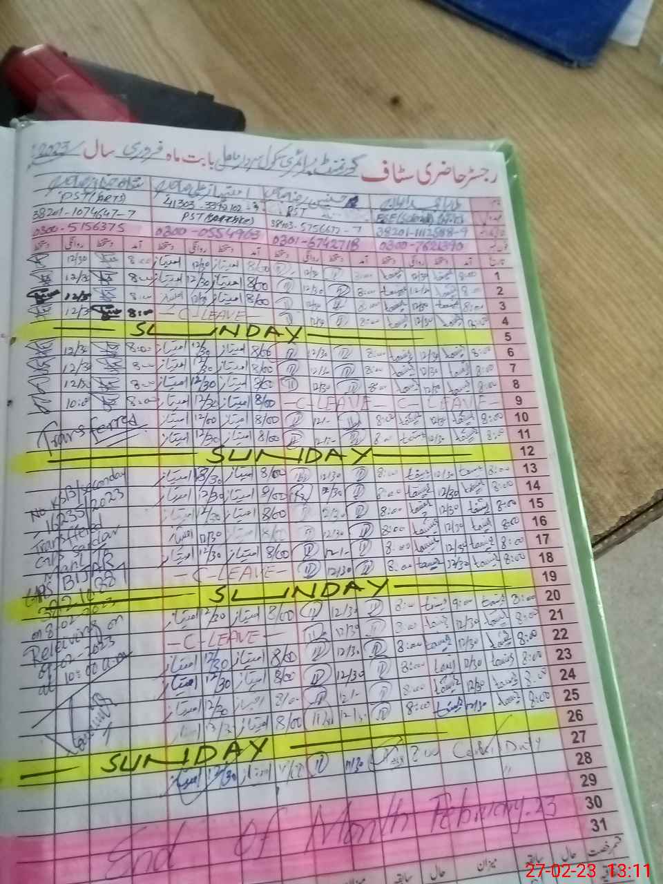 | CNIC | Full Name | Designation | R/C | Absence During Last Calender Month |
