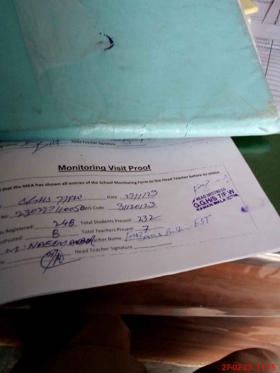 | Attendance Register | Head Teacher | MEA with School | Visit Proof |