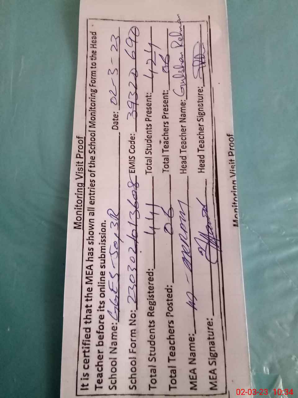 | Attendance Register | Head Teacher | MEA with School | Visit Proof |