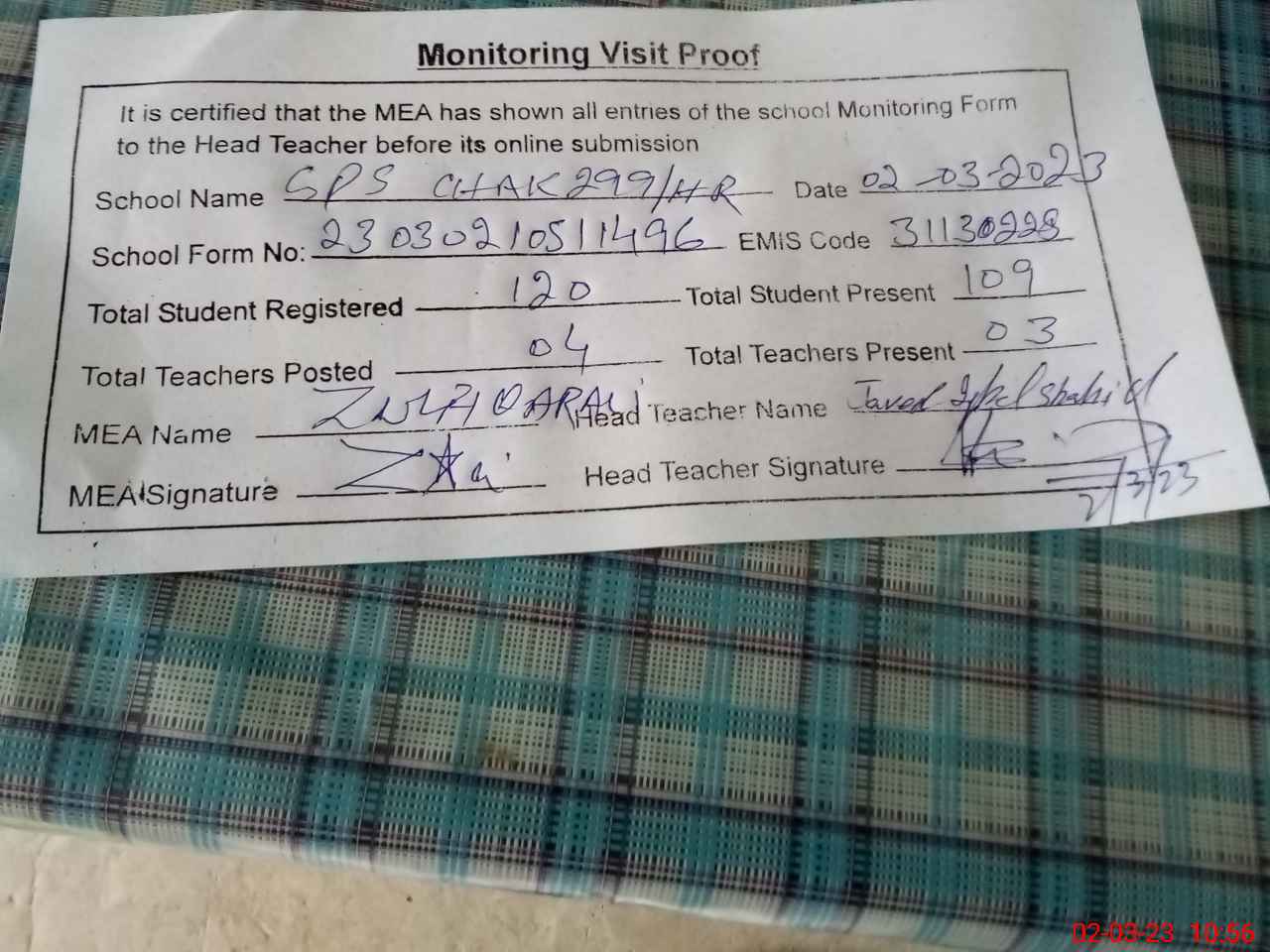 | EMIS Code: 31130228 | Name of School: GPS CHAK NO 299 HR | |||
