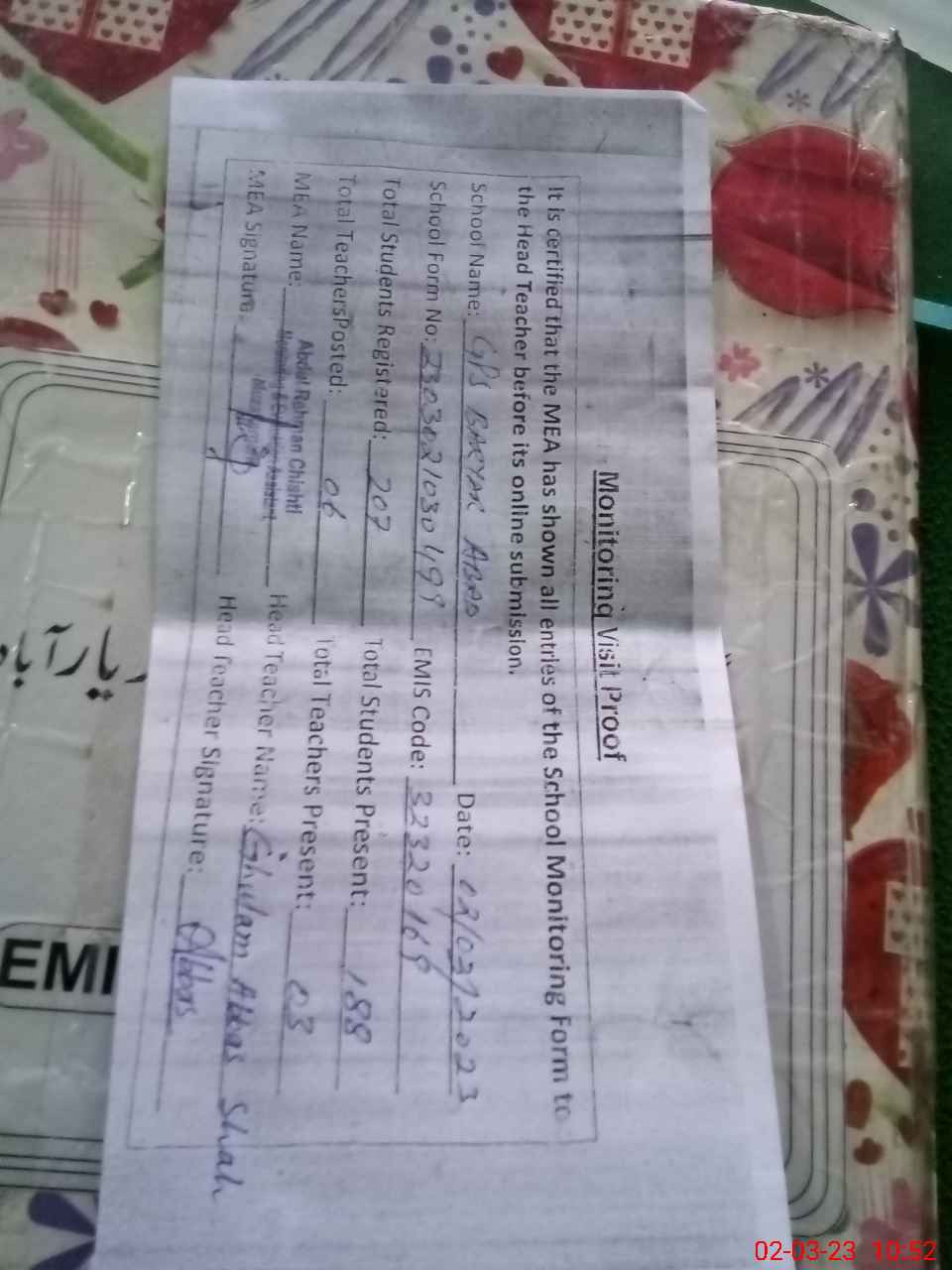 | Attendance Register | Head Teacher | MEA with School | Visit Proof |