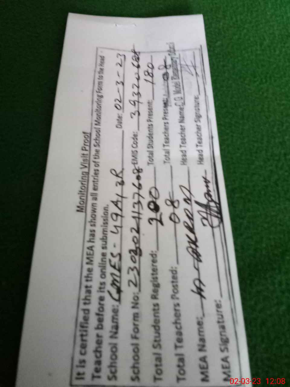 | Attendance Register | Head Teacher | MEA with School | Visit Proof |