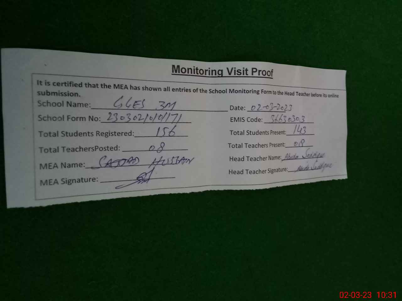 | Attendance Register | Head Teacher | MEA with School | Visit Proof |