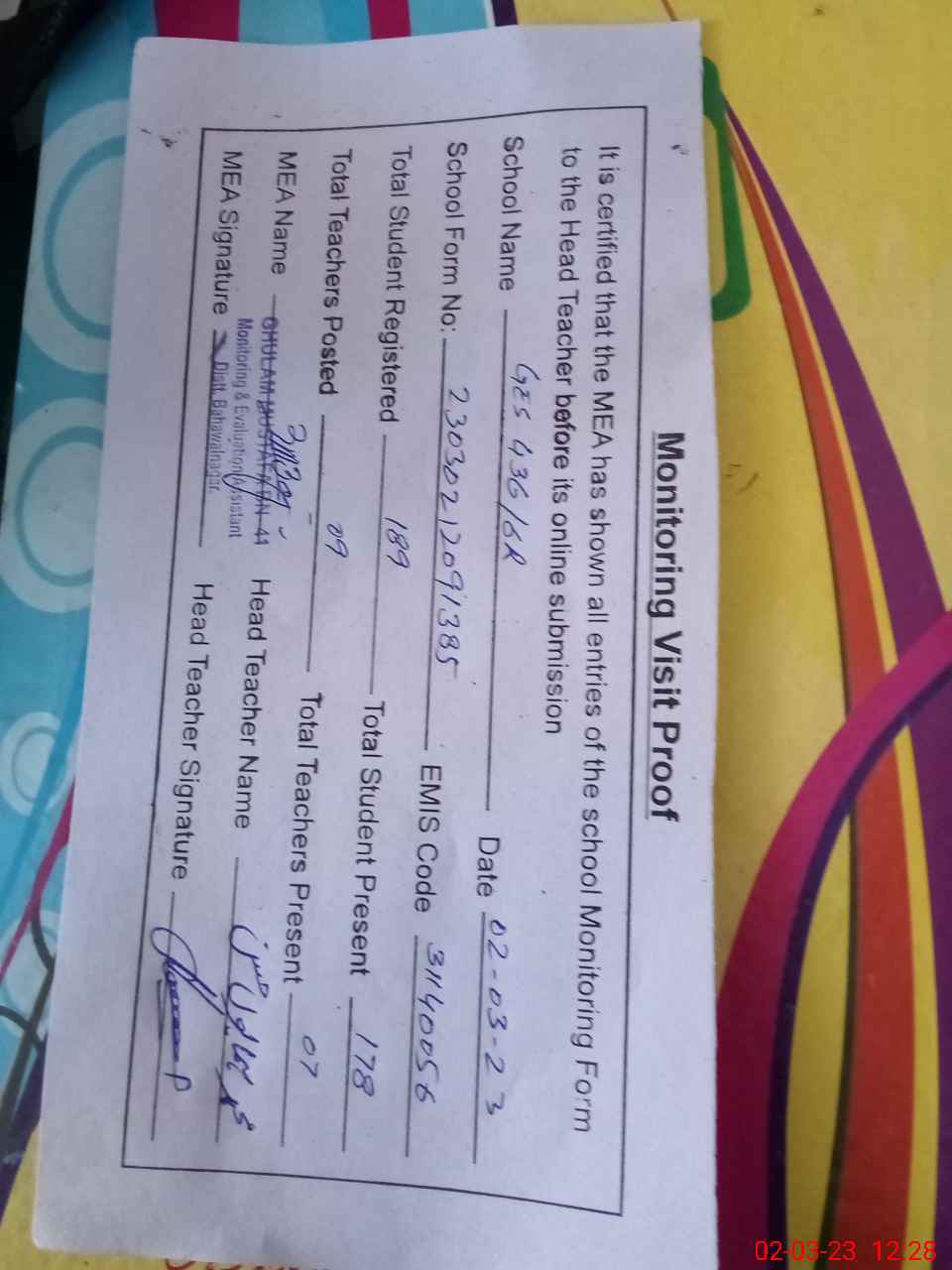 | Attendance Register | Head Teacher | MEA with School | Visit Proof |