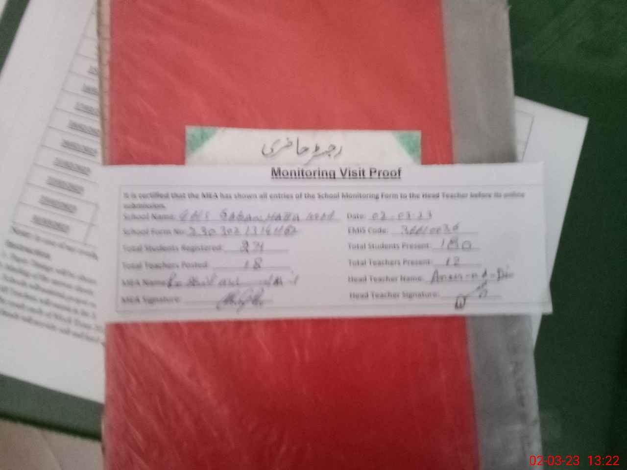 | Attendance Register | Head Teacher | MEA with School | Visit Proof |