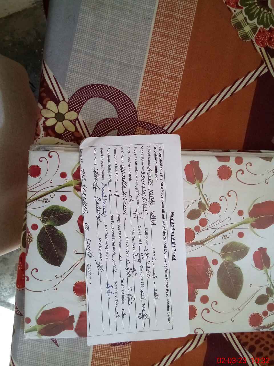 | Remarks (Use Separate Page if Required): One teacher on duty on class room not functional over all clean good | |||||