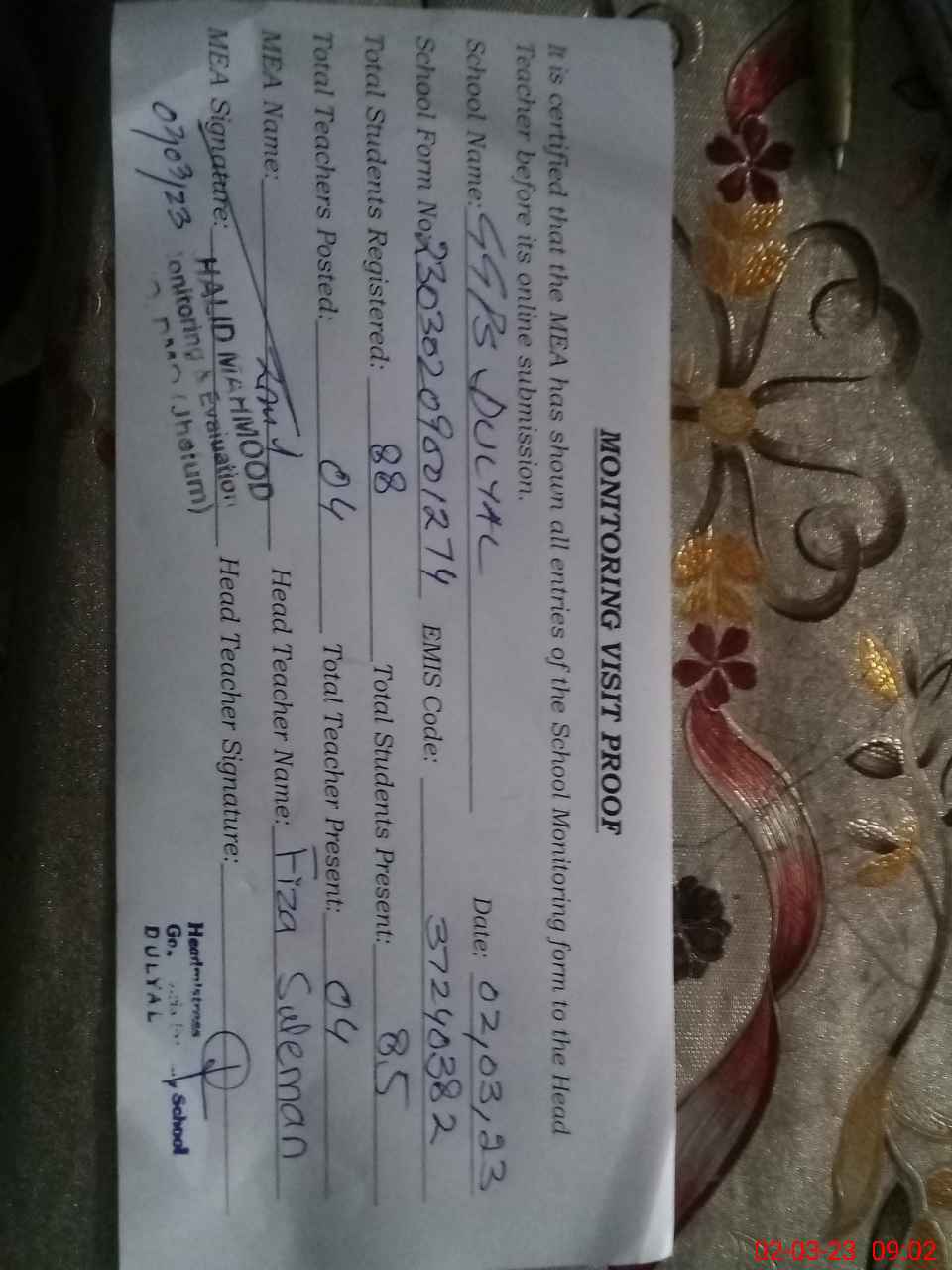 | Attendance Register | Head Teacher | MEA with School | Visit Proof |