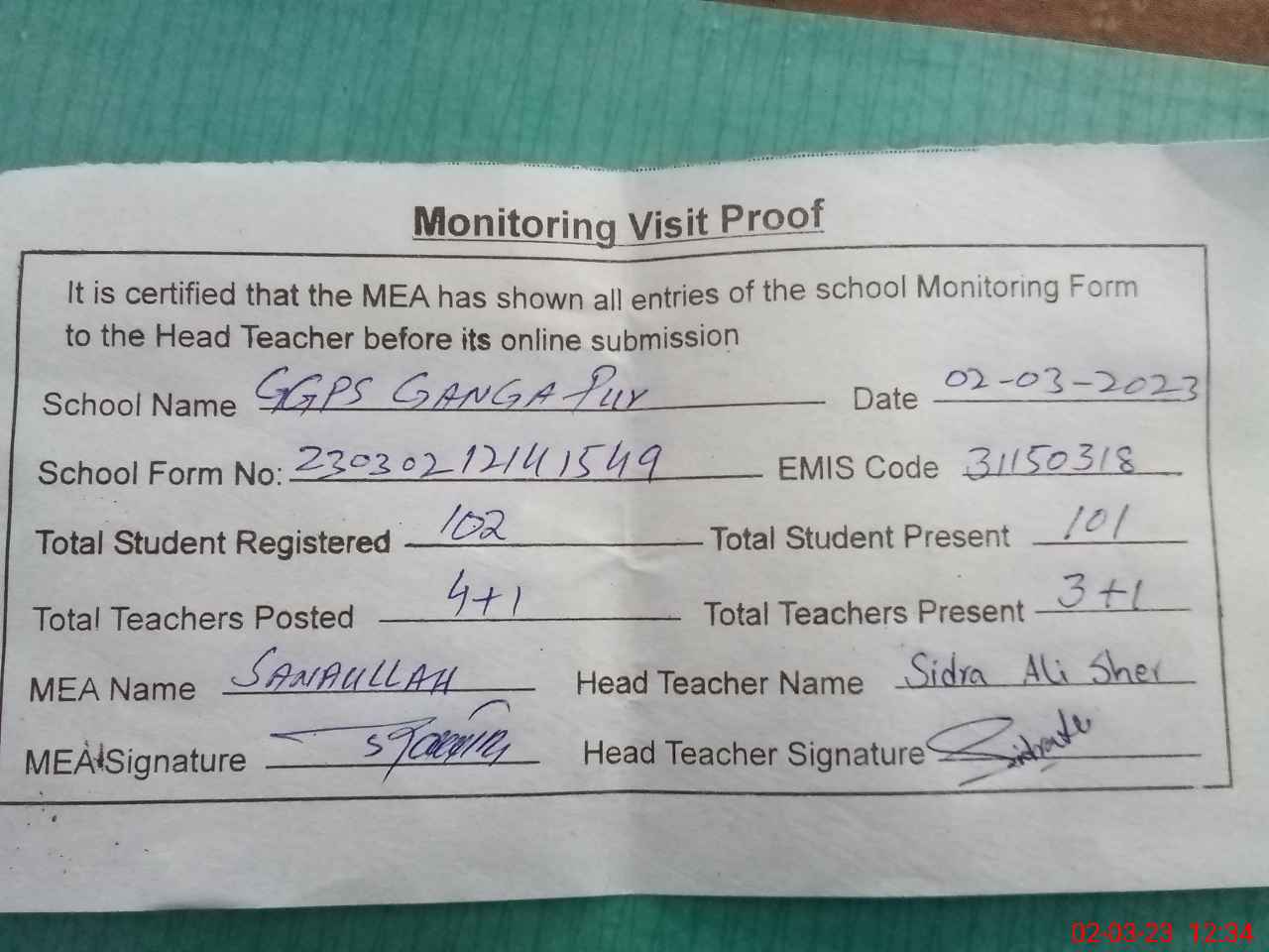 | Attendance Register | Head Teacher | MEA with School | Visit Proof |