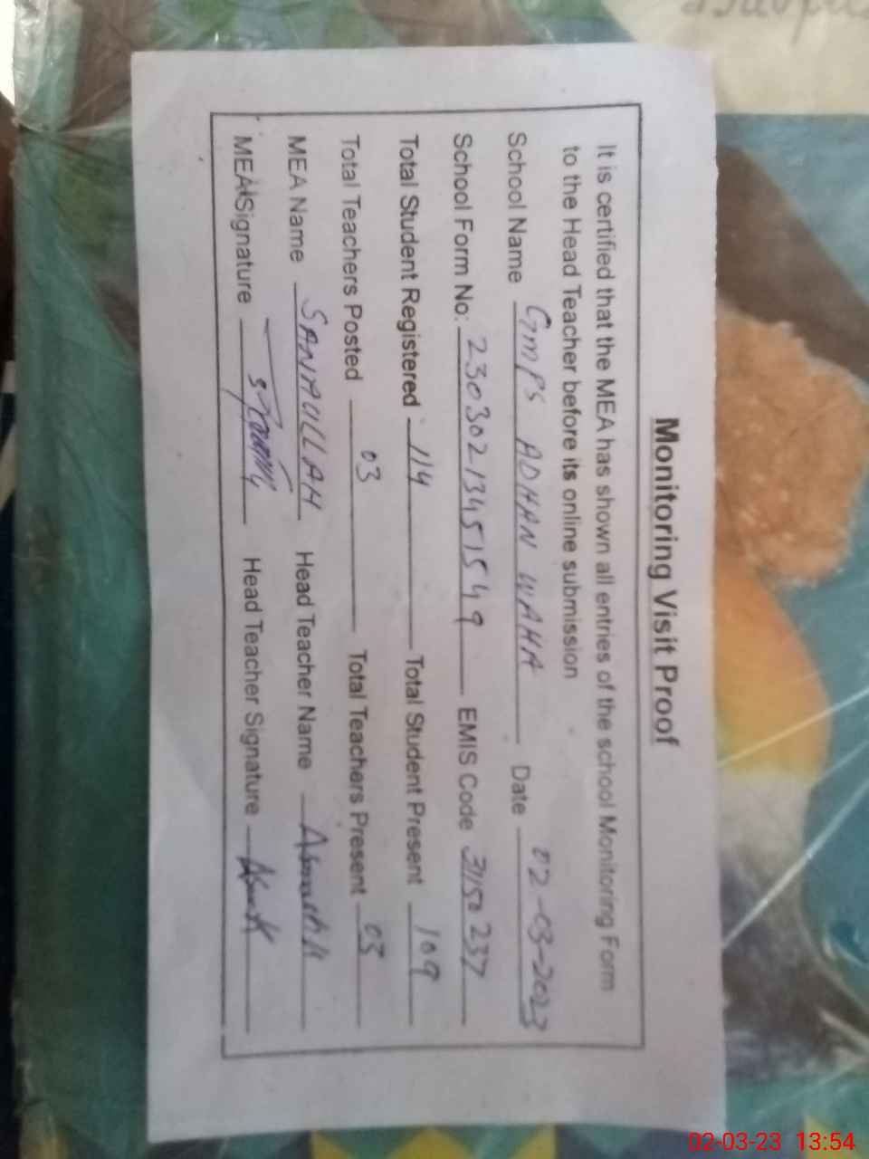 | EMIS Code: 31150237 | Name of School: GMPS ADHAN WAH | |||