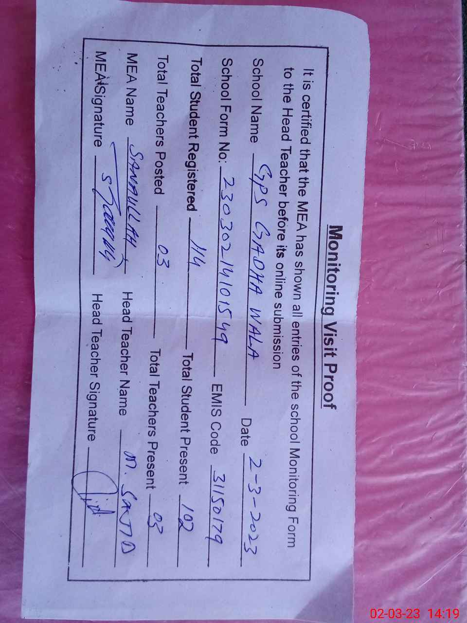 | EMIS Code: 31150179 | Name of School: GPS GADHEY WALA | |||