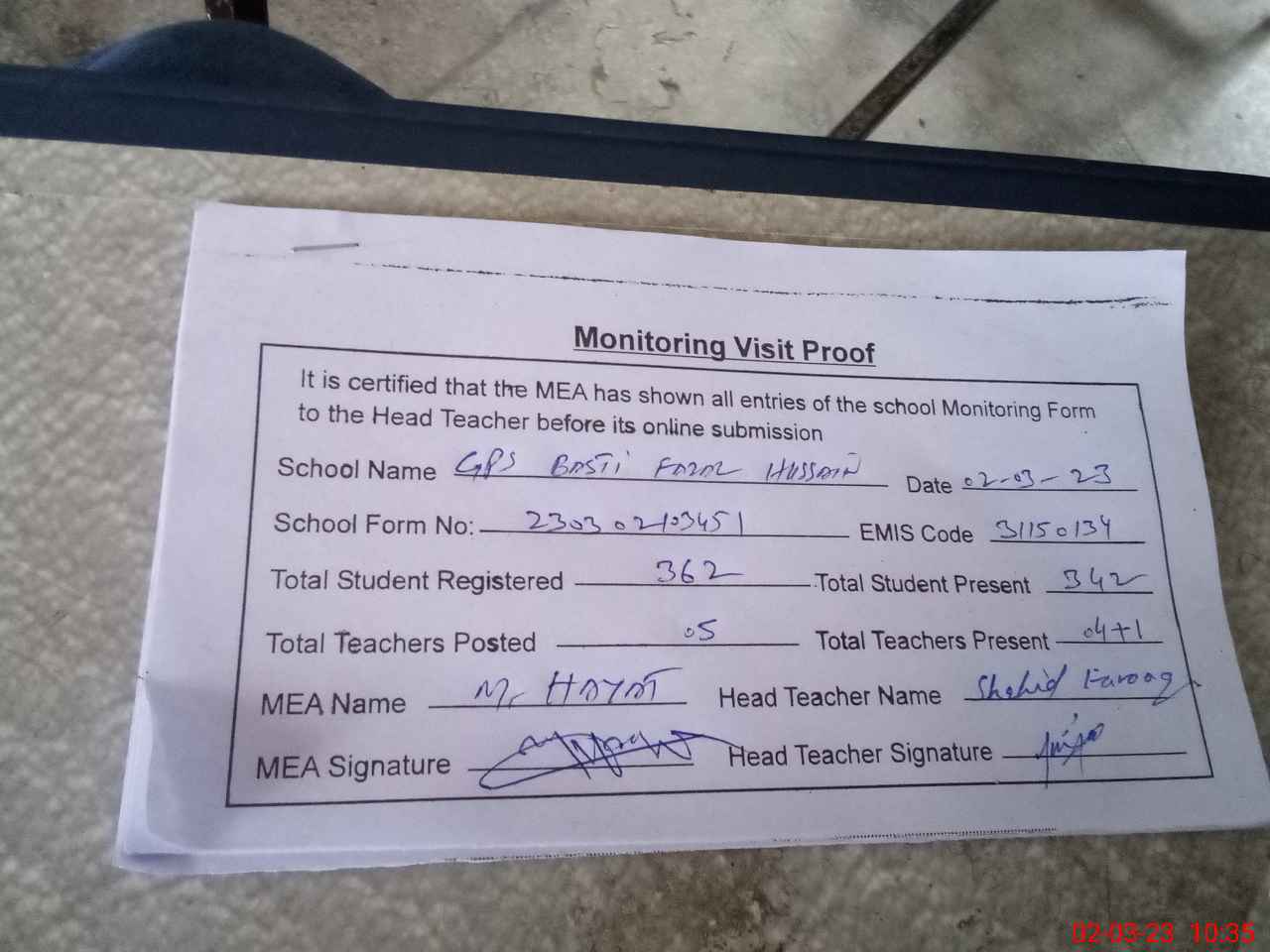 | Attendance Register | Head Teacher | MEA with School | Visit Proof |
