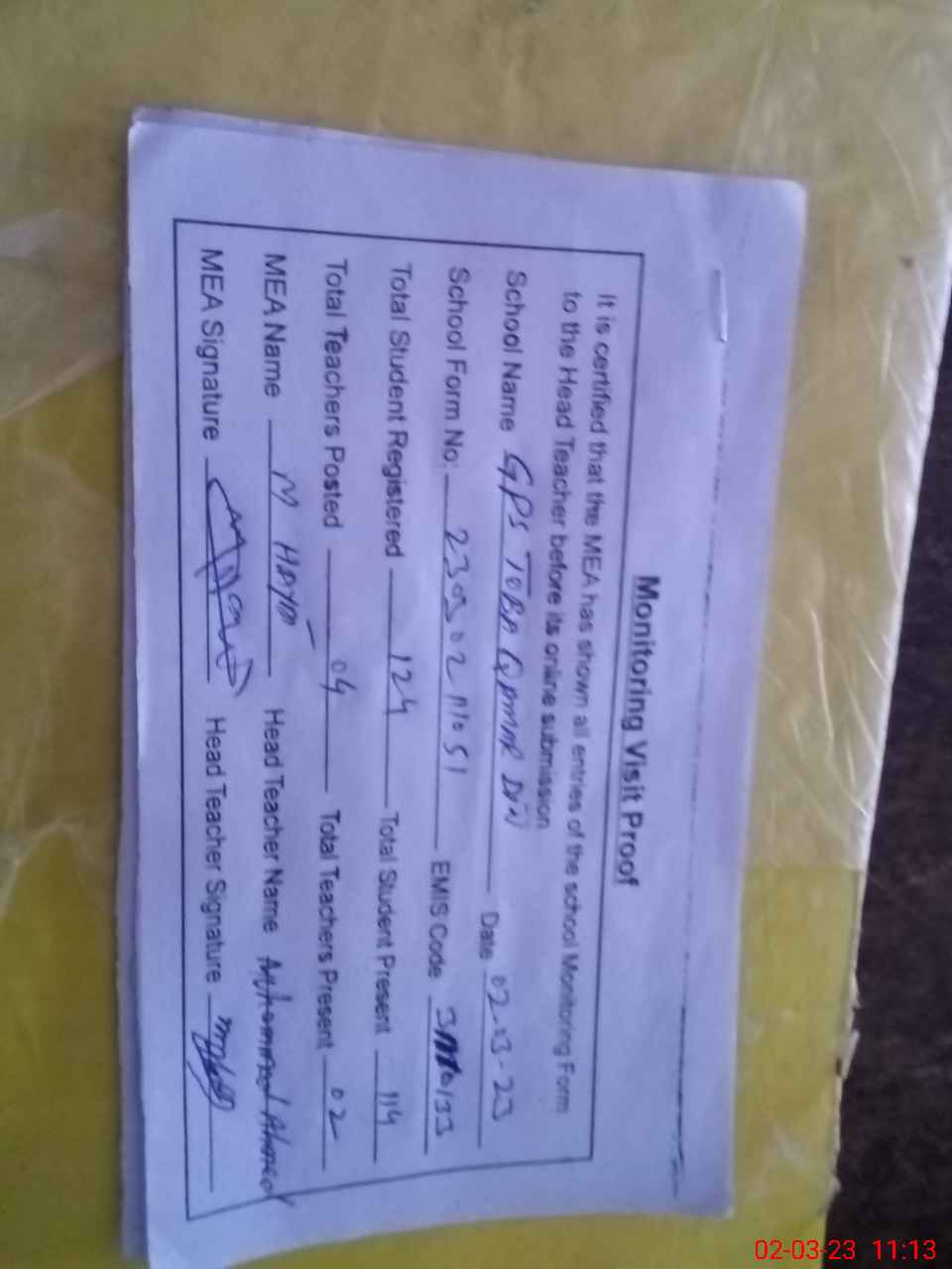 | Attendance Register | Head Teacher | MEA with School | Visit Proof |