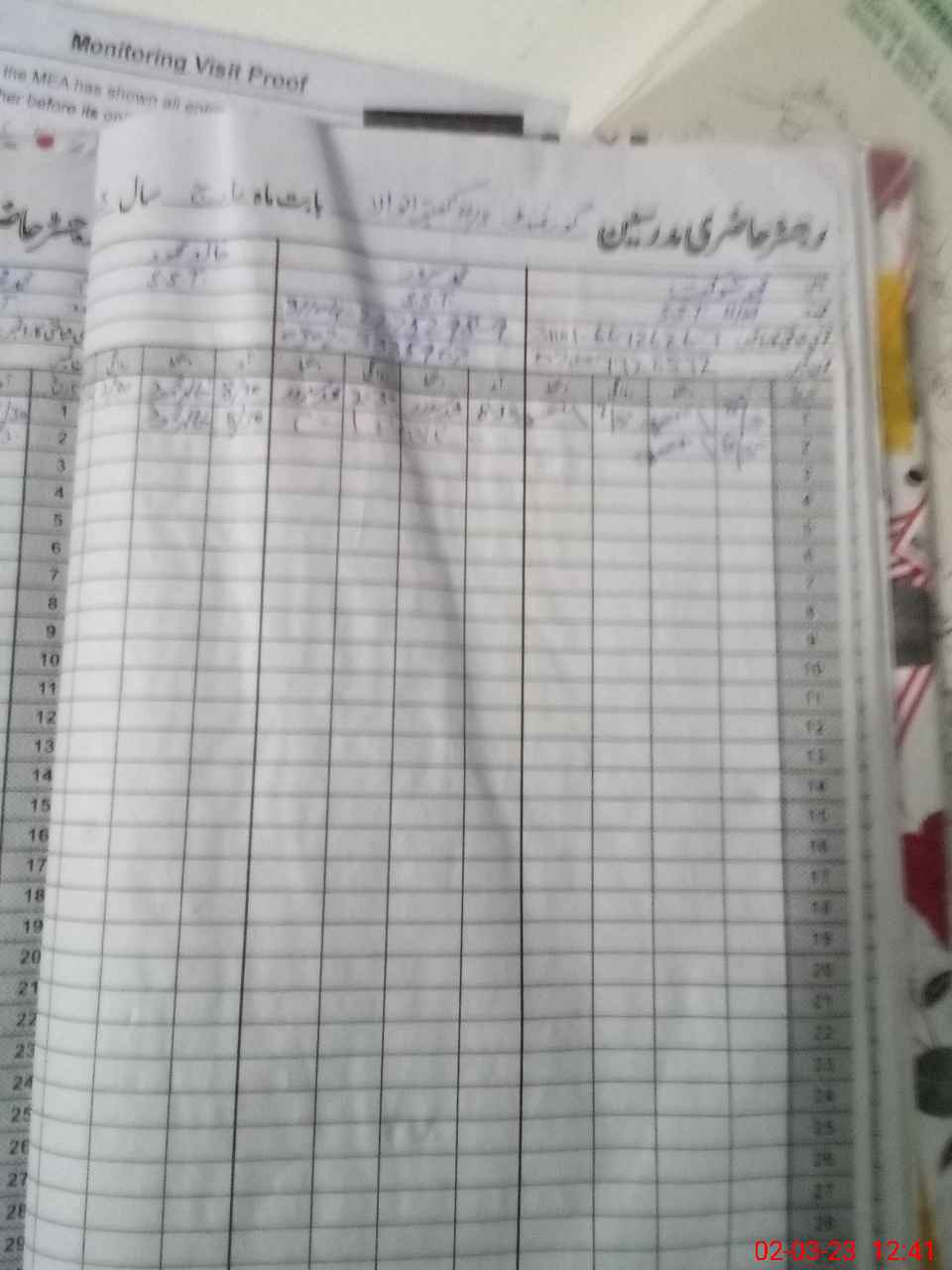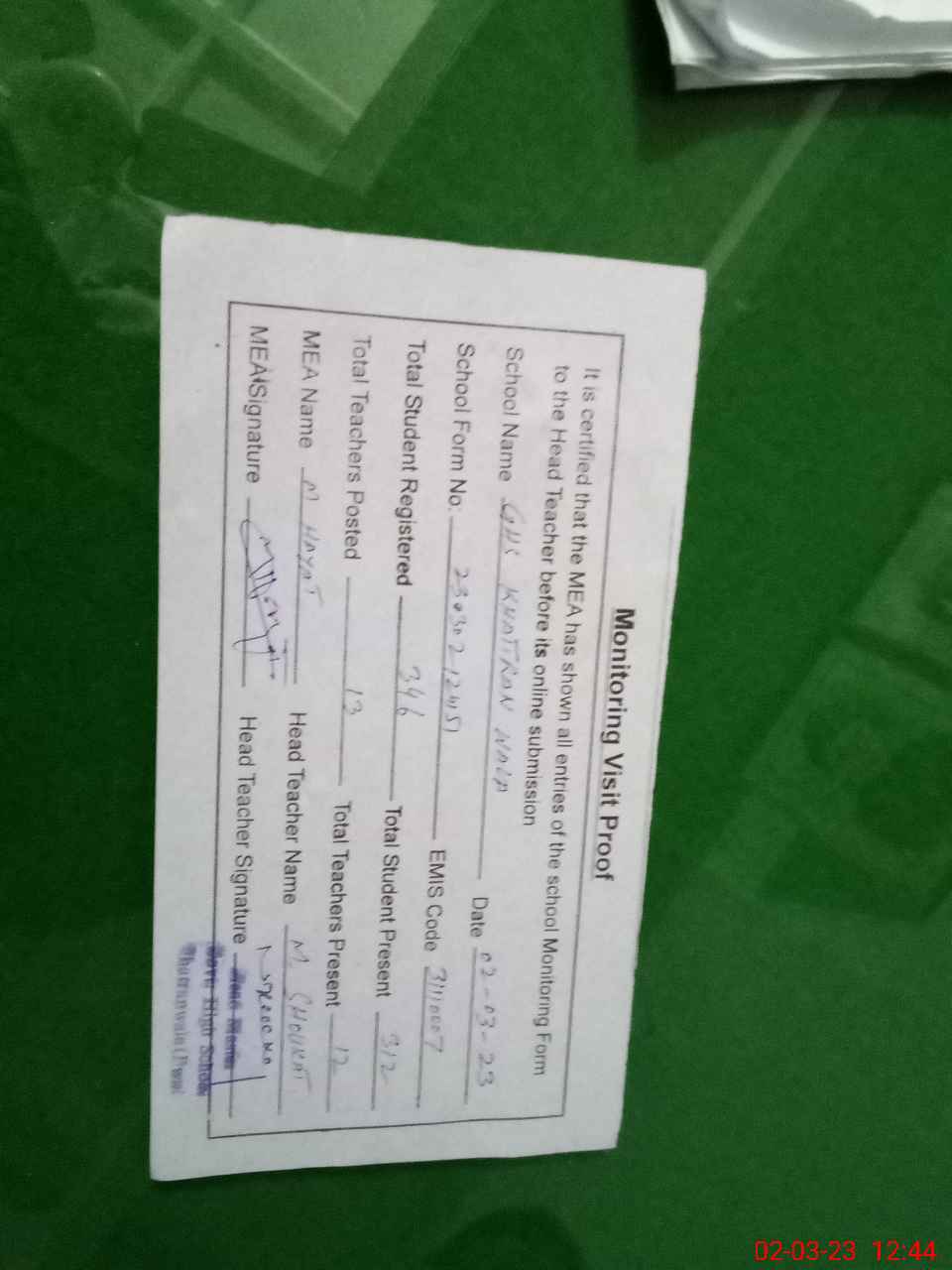 | Attendance Register | Head Teacher | MEA with School | Visit Proof |