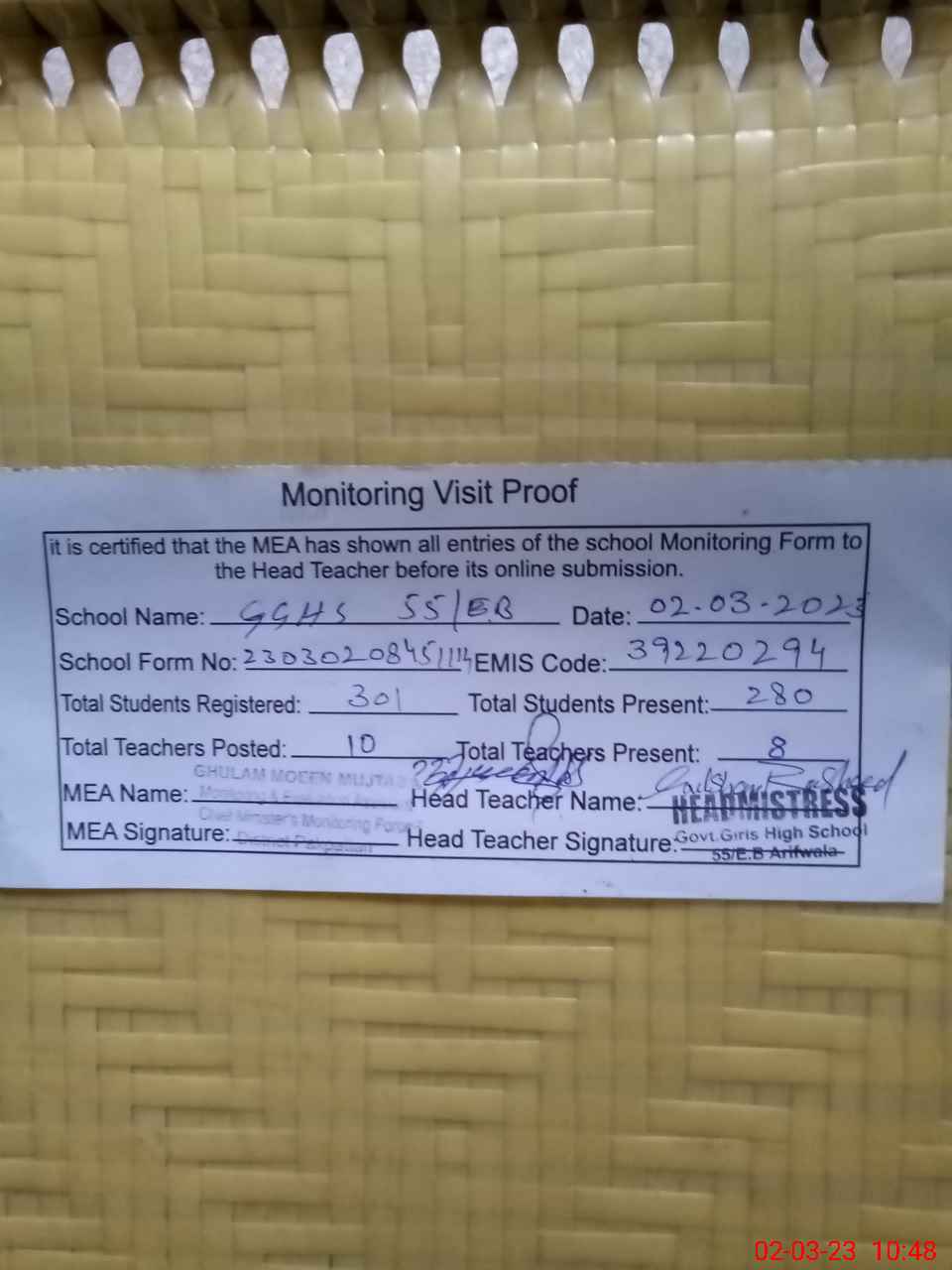 | Certified that this School was Inspected by the Undersigned MEA/DMO Today and the Information Stated Above is as Per Record. | |||||