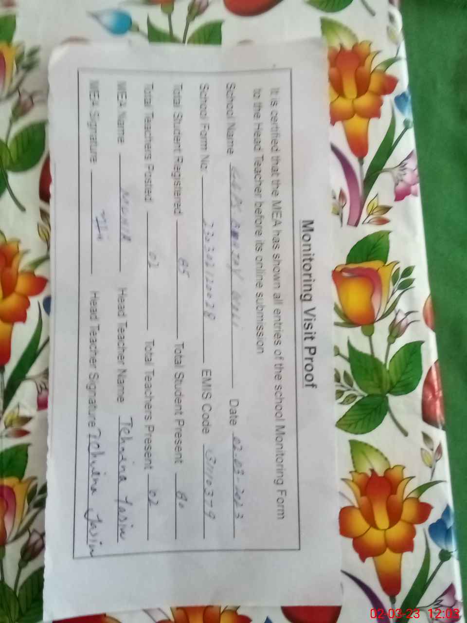 | Attendance Register | Head Teacher | MEA with School | Visit Proof |