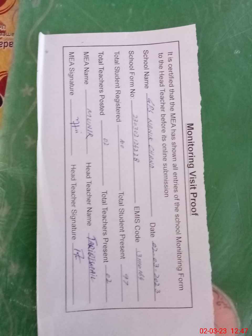 | Attendance Register | Head Teacher | MEA with School | Visit Proof |