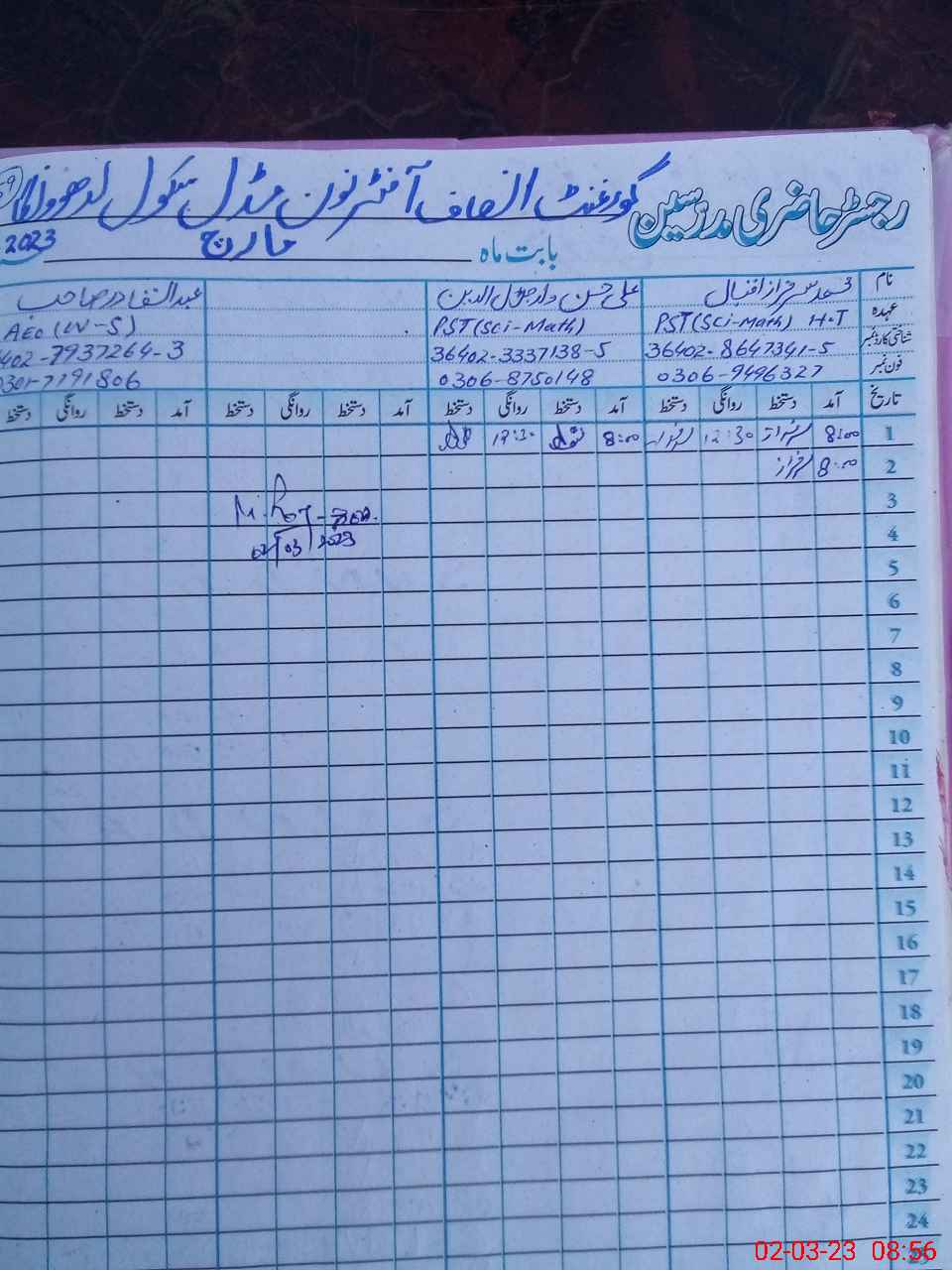 | Name: Mu**** Sa**** Iq**** Designation: (School Headmaster's/Headmistress's) PST Phone/Cell Number: 03**** |