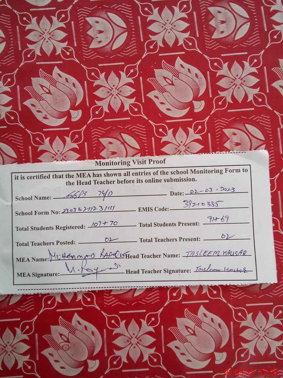 | Attendance Register | Head Teacher | MEA with School | Visit Proof |