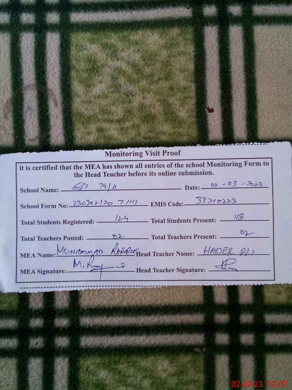 | Attendance Register | Head Teacher | MEA with School | Visit Proof |