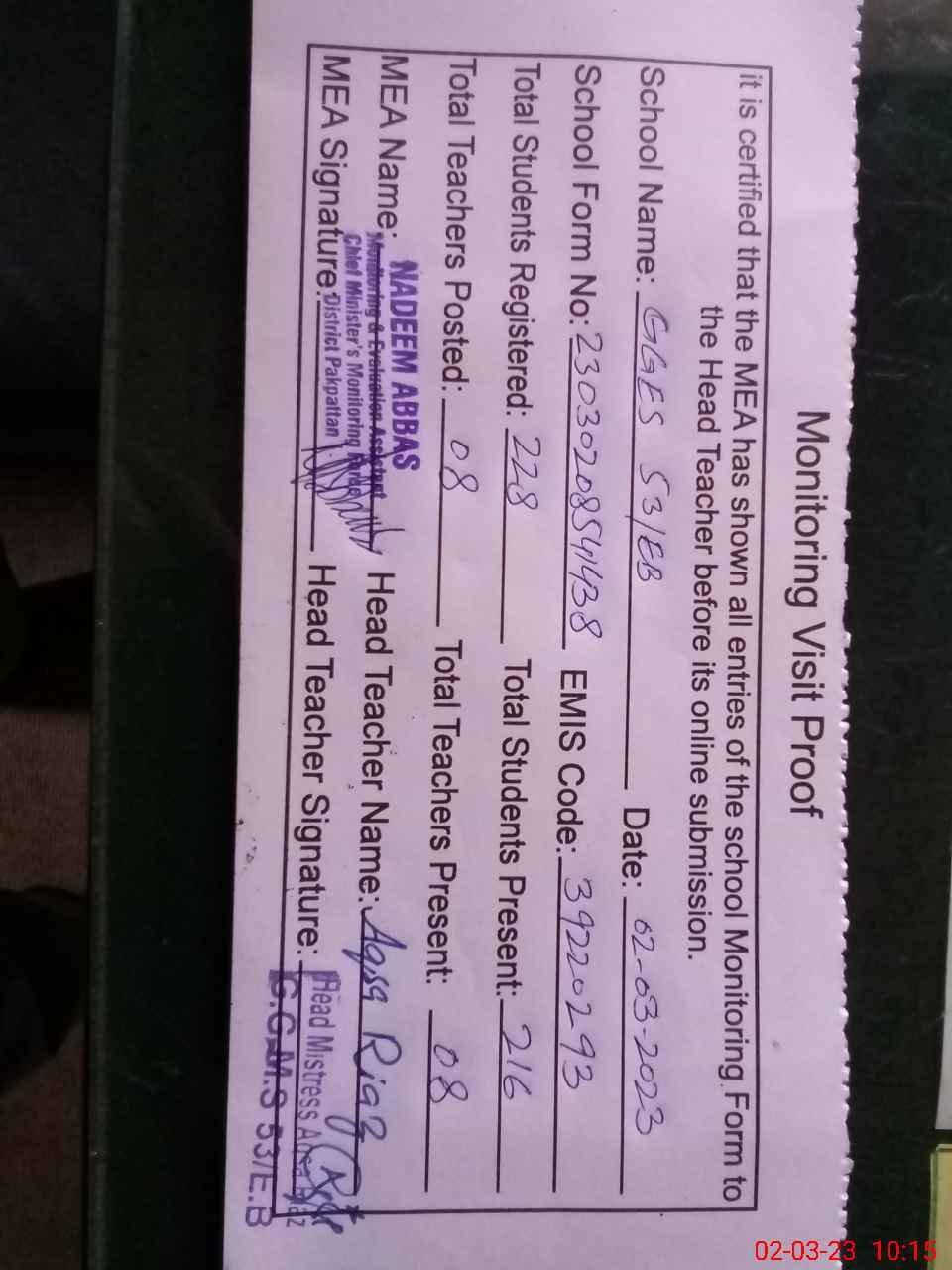 | Certified that this School was Inspected by the Undersigned MEA/DMO Today and the Information Stated Above is as Per Record. | |||||