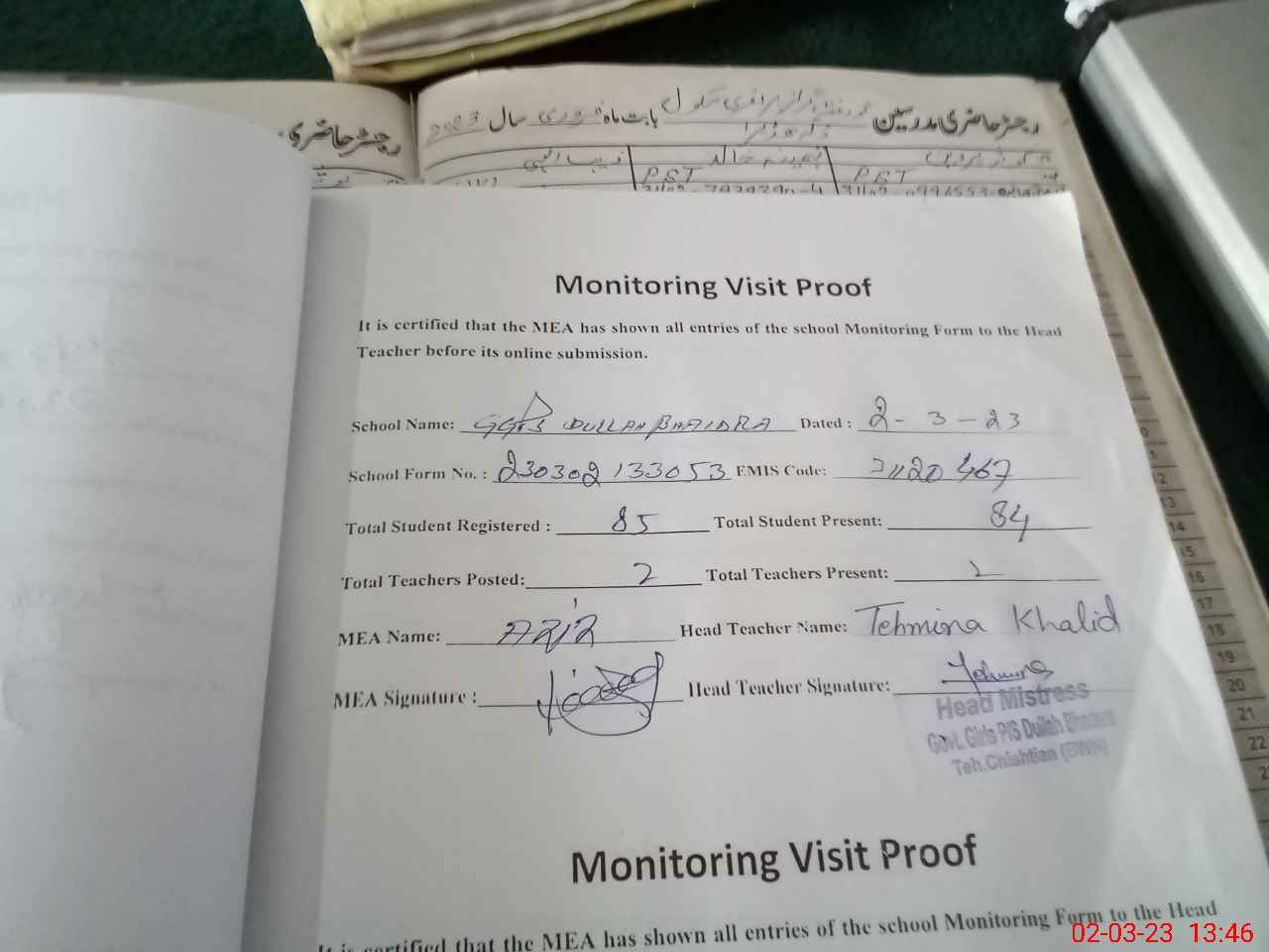 | Attendance Register | Head Teacher | MEA with School | Visit Proof |