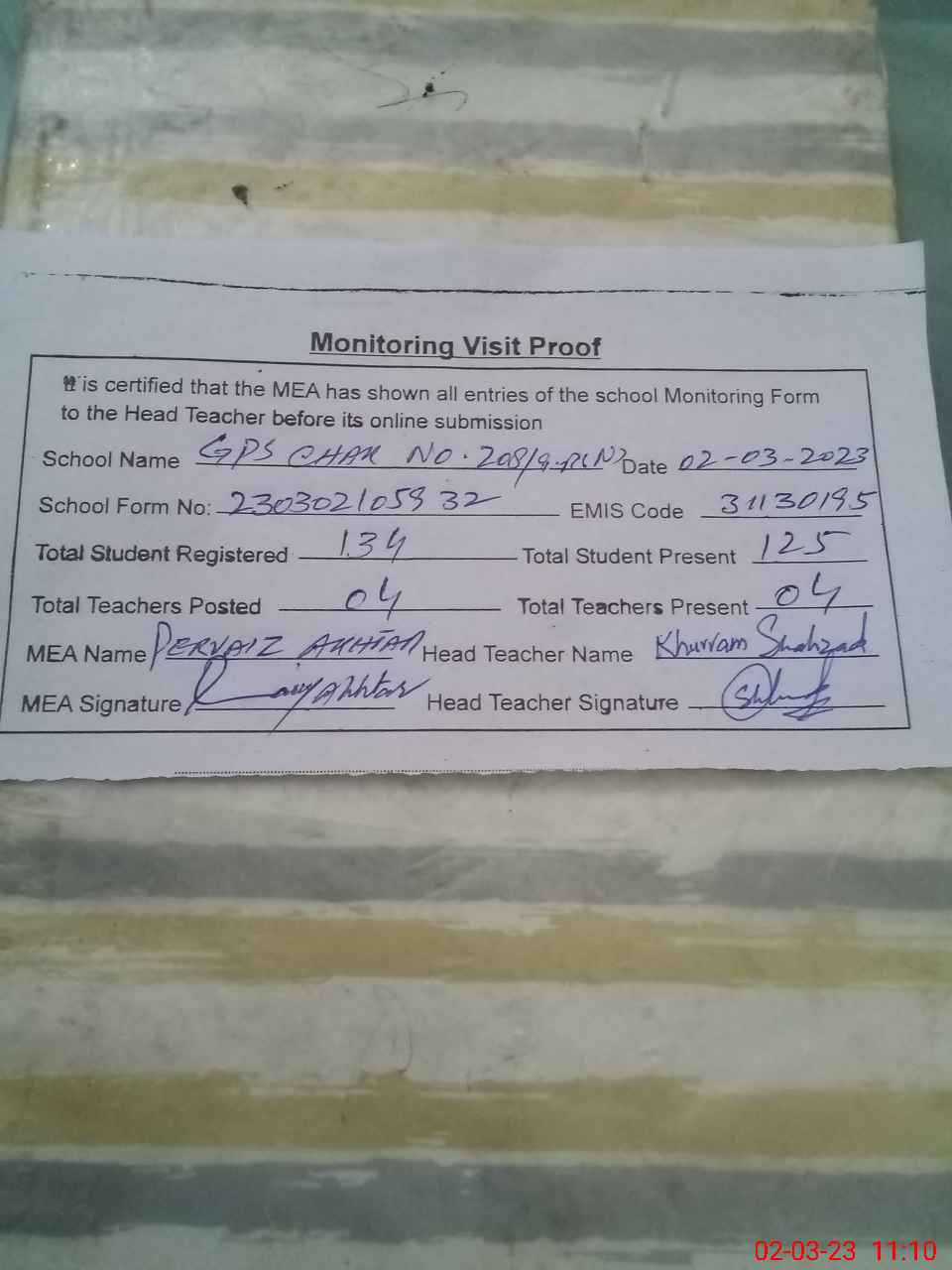| Attendance Register | Head Teacher | MEA with School | Visit Proof |