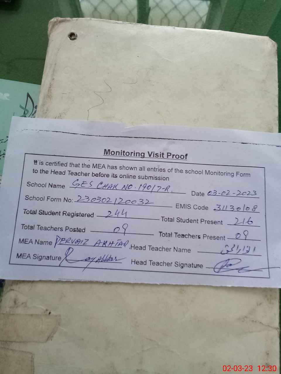 | EMIS Code: 31130108 | Name of School: GHS CHAK NO.190/7-R | |||