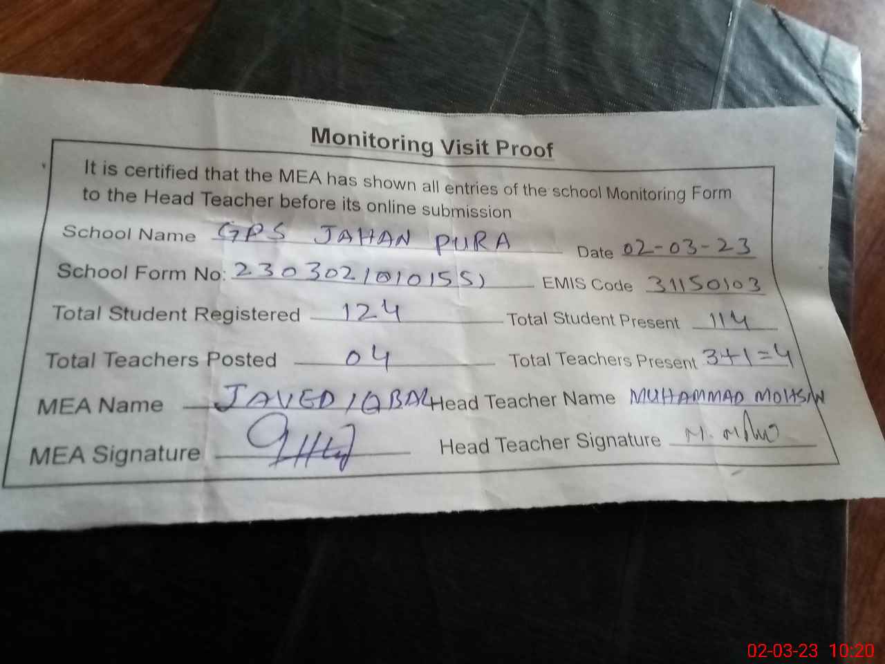 | Attendance Register | Head Teacher | MEA with School | Visit Proof |
