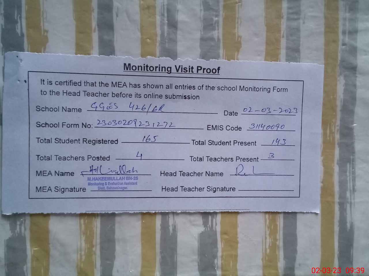 | Attendance Register | Head Teacher | MEA with School | Visit Proof |